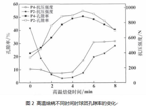 (3) 不同粘結(jié)劑的球團干球抗壓強度相差較大,但在高溫焙燒時強度變化趨勢基本一致,在焙燒初期 0~2 min 時球團抗壓強度快速降低, 4 ~8 min 時球團強度逐漸提高。