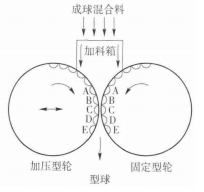 對輥壓球機是發(fā)展較早、應用較多的壓團法設備,因其對原料粒度要求低、成球質量高、可用有機粘結劑,且有機粘結劑在燃燒過程中可以提供部分熱量,燃燒產(chǎn)物少,不會影響到直接還原后產(chǎn)品品質,對輥壓球機是轉底爐工藝中普遍應用的原料成球設備。