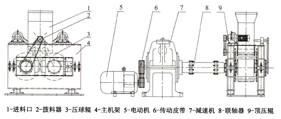 壓球機(jī)是生產(chǎn)線的關(guān)鍵設(shè)備,其主體結(jié)構(gòu)是一對(duì)相向轉(zhuǎn)動(dòng)的壓輥,其中一個(gè)壓輥是固定安裝的,另一個(gè)壓輥為活動(dòng)輥,通過液壓系統(tǒng)支撐在機(jī)架上,壓輥的表面有定制的模具,當(dāng)物料定量連續(xù)進(jìn)入或通過預(yù)壓機(jī)強(qiáng)制進(jìn)入壓輥中間時(shí),物料就被壓縮成型。