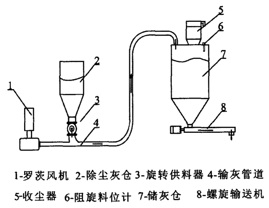 除塵系統(tǒng)手機(jī)的煙塵采用密閉管道正壓稀相輸送方式,將煙塵輸送到只求系統(tǒng)進(jìn)行壓球。采用氣力輸送的優(yōu)點(diǎn)是減少了煙塵的二次倒運(yùn)和因此產(chǎn)生的無組織排放,實(shí)現(xiàn)了煙塵的長距離密閉輸送。如下圖: